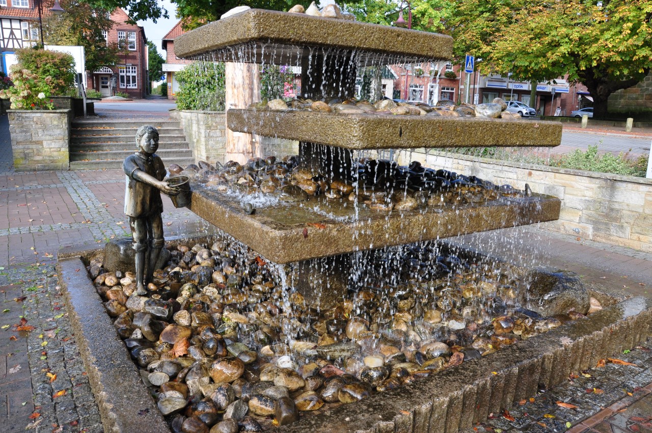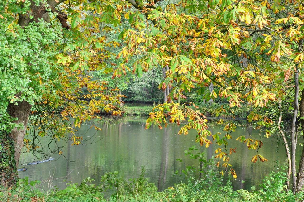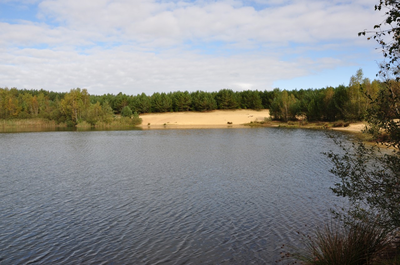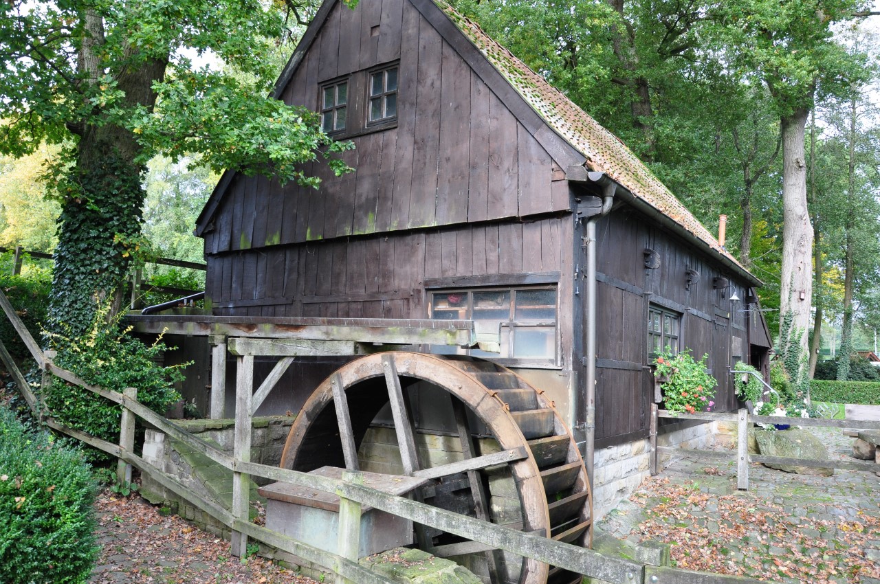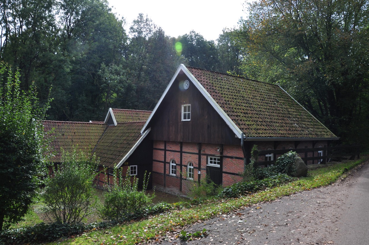 Zondag schijnt de zon en het is heerlijk wandelweer. Voordat we hier naar toe gingen,  had ik bij Touristiek Uelsen kaarten opgevraagd van dit gebied. Voor € 5,00  kreeg ik een pakket mooie wandelkaarten en andere info thuis gestuurd.  Ik vind het heerlijk om routes uit te zoeken, dat doe ik graag op de kaart in combinatie met de computer. Zondag starten we vanaf  Café am Muhlenteich in Wilsum. Als we aankomen staat de P vol met auto’s. Het is een echte Duitse Horeca gelegenheid met een mooie watermolen en vijver. We wandelen eerst een rondje rond de vijver en langs de watermolens en gaan dan op pad door de bossen richting de Itterbecker heide.  Het landschap is glooiend en afwisselend,  we passeren een mooie zandplas en hier en daar lopen we langs de weilanden midden in het bos. De Itterbecker heide is glooiend met aan de rand grazende koeien en op het hoogste punt een prachtig uitzicht. Hierna lopen we weer door de bossen en komen uiteindelijk via twee leuke vijvers op het Podagristen pad. Dit pad is een bewegwijzerde wandelroute van ca 75 km vanaf de Burcht in Bad Bentheim naar het kasteel in Coevorden. Dit pad werd door drie Podagristen(Podologen) uit Coevorden in 1843 verkend en in een humoristisch reisverhaal vastgelegd.