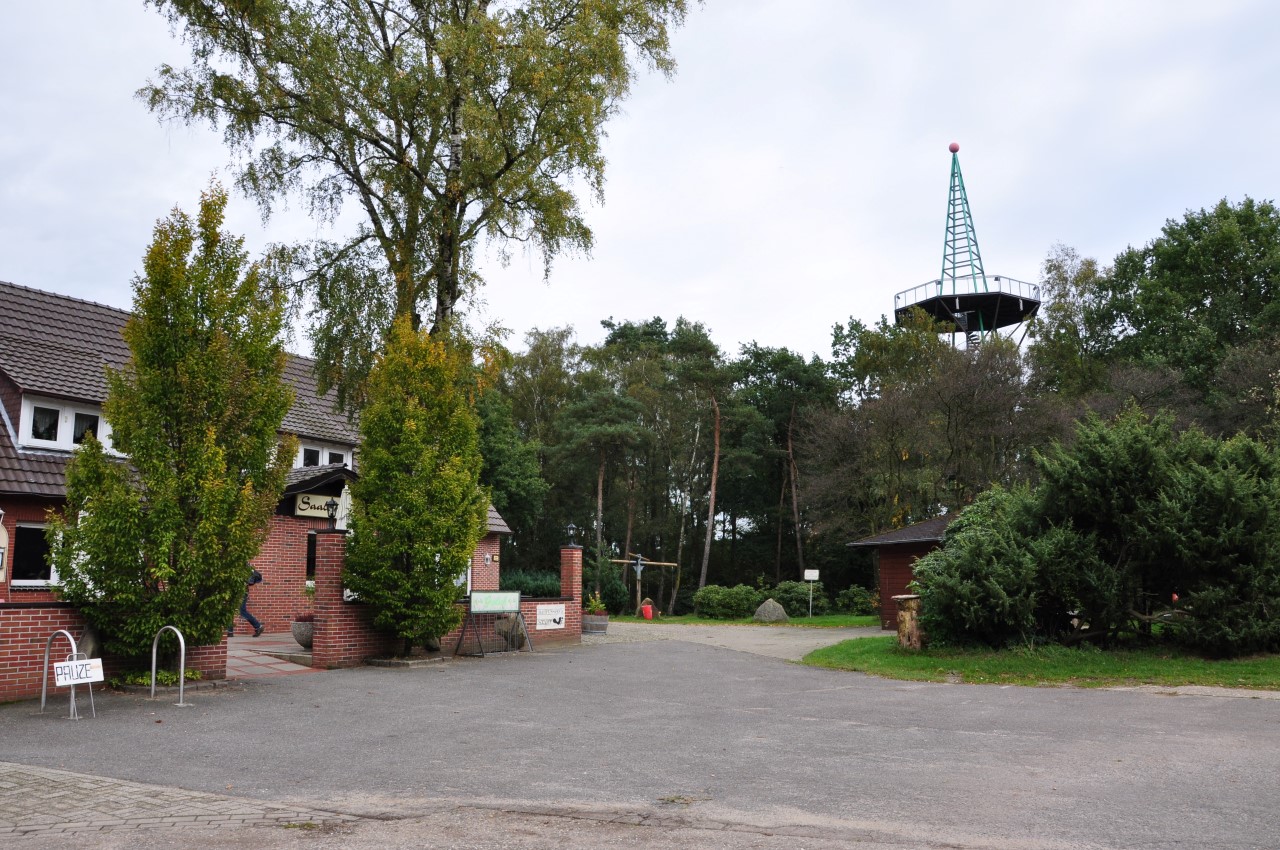 Maandag, onze laatste dag, lopen we een route vanuit Uelsen ‘Auf den Spuren den Bronzezeit’. Dit is een gemarkeerde route met paarse pijltjes van 25,2 km en gaat gedeeltelijk door Nederland. De route bestaat uit twee lussen. Wij doen één lus, tot aan de uitkijktoren bij Getelo en weer terug naar Uelsen, ongeveer 17 km. Het eerste deel is landelijk en glooiend. Het tweede deel lopen we meer door het bos. We lunchen halverwege bij de uitkijktoren. Vanaf deze 22 meter hoge toren heb je bij mooi weer een fantastisch uitzicht over het gebied op de grens van Nederland en Duitsland.