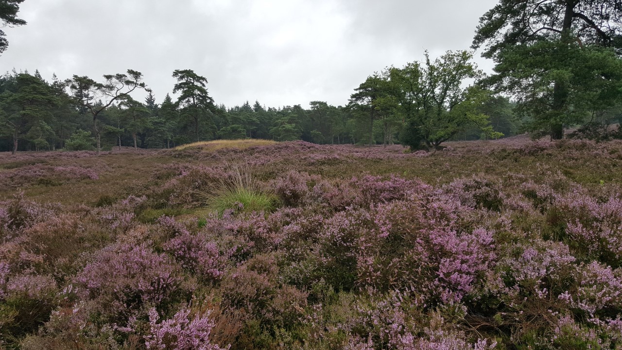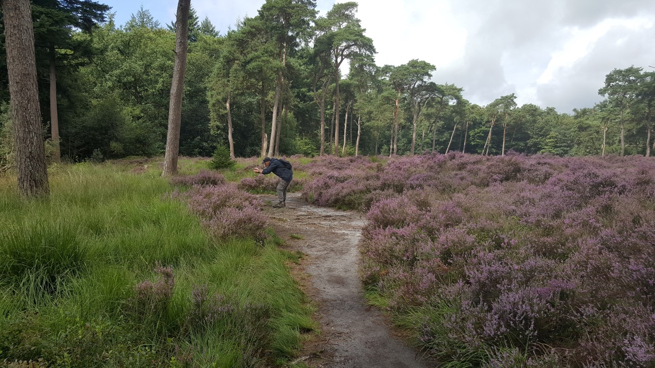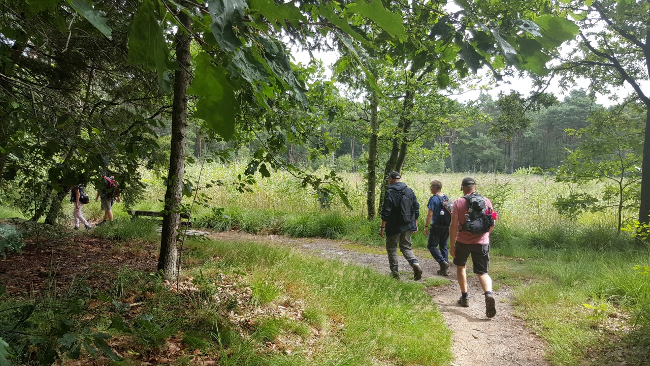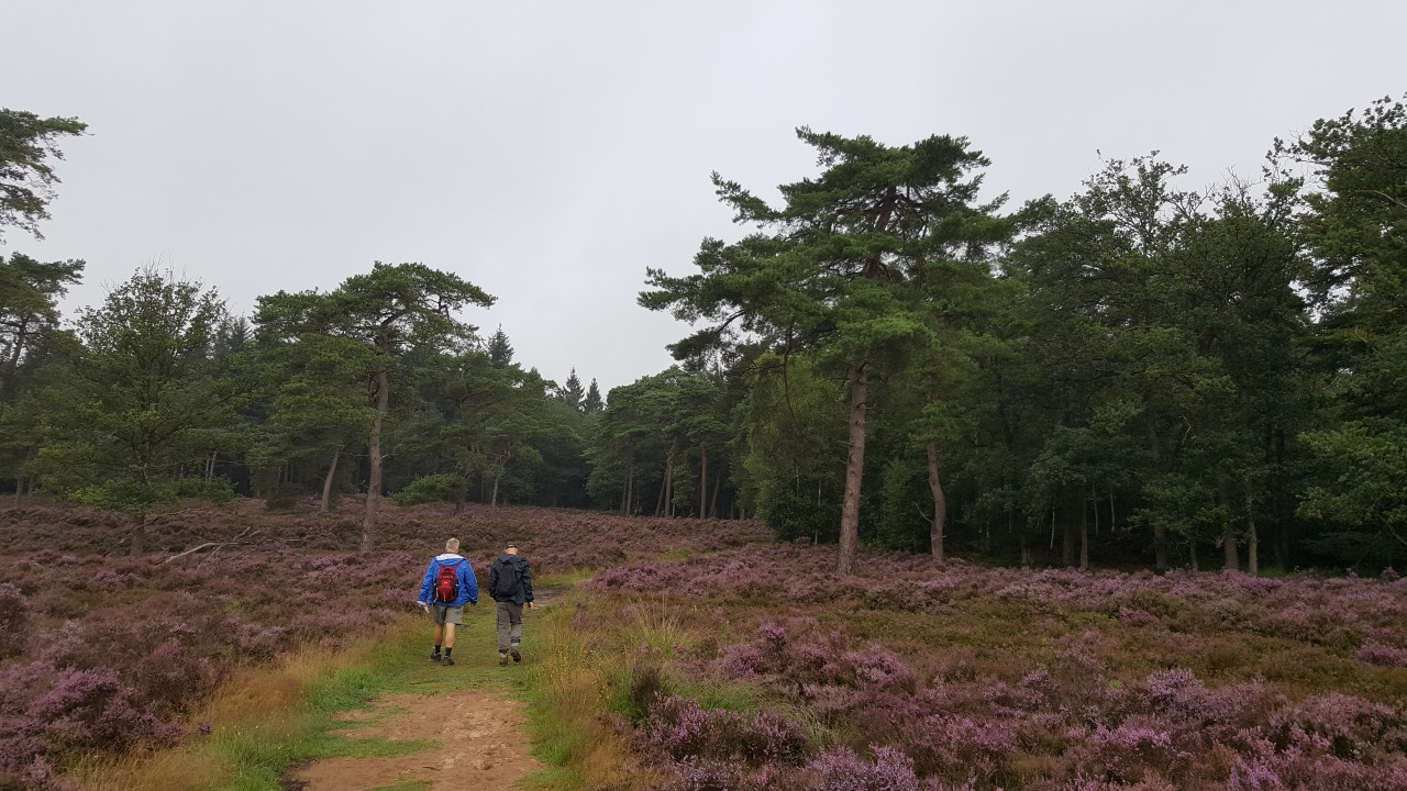 Hij had een combinatie bedacht van de bestaande blauwe en paarse wandelroutes. Nadat we het eerste paarse pijltje hadden gevonden, gingen we op pad met 7 dappere wandelaars. Het bleef wat miezerig in het begin en we moesten zelfs schuilen voor echte regen, maar het mocht de pret niet drukken. Om het met Cruyff te zeggen:  ‘elk nadeel heb z’n voordeel’,  het was wel prachtig groen in het bos, de heide glom van het verse water en was prachtig paars. We passeerden enkele mooie heidevelden en gingen daarna op pad naar ‘de Woldberg’.  Mooie statige bomen en diepe uitgesleten paden. We maakten een uitstapje naar de klimtoren , die naast de snelweg ligt, 25 meter hoog. Twee mannen durfden de uitdaging wel aan en klommen naar boven.  We passeerden daarna nog een kleine ven en liepen door het bos terug. De wandeling was uiteindelijk 14 KM. Na nog een tosti of een kop soep gingen we allemaal weer voldaan richting eigen huis.