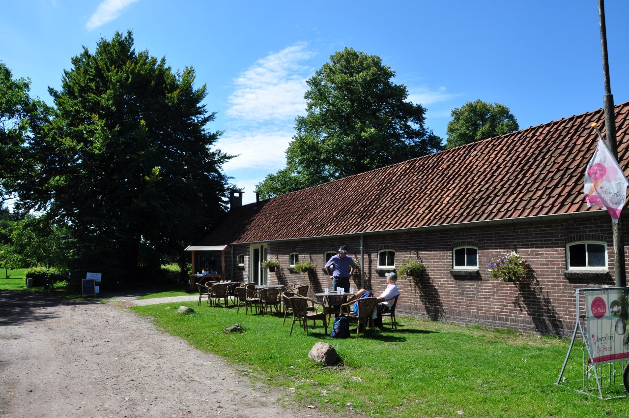 Op zondag stond een eigen wandeling gepland. Opnieuw werden we gewekt door gespetter op het dak van onze caravan.  Dit keer een behoorlijke bui, dus daarom toch een beetje uitslapen. Na een laat ontbijt op pad. Vertrekpunt Vledder, ‘De Tippe‘. Hier dronken we eerst een cappuccino, daarna trokken we de wandelschoenen aan en kuieren maar.  Allereerst een stuk langs de landerijen.  Deze paden worden niet veel gebruikt. Dat was te merken aan de brandnetels. We liepen verder door het bos en kwamen we uit bij de dag-camping ‘Vledderhof’.  We volgden stukjes gele en blauwe route en ontdekten halverwege een heerlijk rustpunt waar:  vers boerenijs, koffie en heerlijk gebak werd geserveerd. Na genoten te hebben van heerlijk gebak met vers fruit, gingen we over tal van kleine bospaadjes terug richting Vledder. We kwamen langs een aantal hele mooie grote vennen. Plekjes om bij weg te dromen. We deden nog een extra lus door het het bos ‘Vledderveld’ om zo via de weilanden weer naar Vledder terug te lopen. 18 heerlijke km gelopen. Moe en voldaan trakteerden we onszelf op bier en bitterballen.  Deze route werk ik binnenkort uit voor de website.